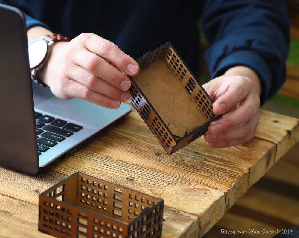 В его руках, вырезанная на лазерном станке копия здания больницы. По словам Султана, дизайн он разрабатывает на компьютере за полчаса-час, однако создание конструкции занимает чуть больше времени.