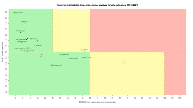Опубликована матрица оценки эпидемиологической ситуации в регионах Казахстана на 25 декабря 2021 года, передает BaigeNews.kz со ссылкой на coronavirus2020.kz.