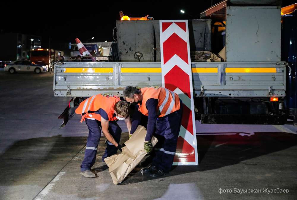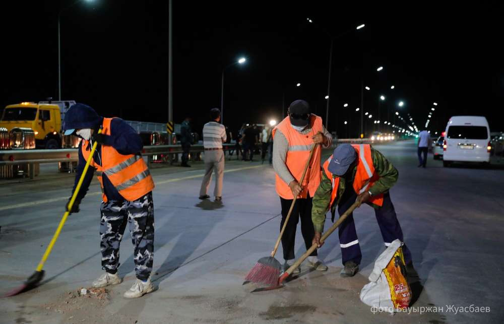 Уборщики расчищают дорогу для первых въезжающих в Нур-Султан автомобилистов.