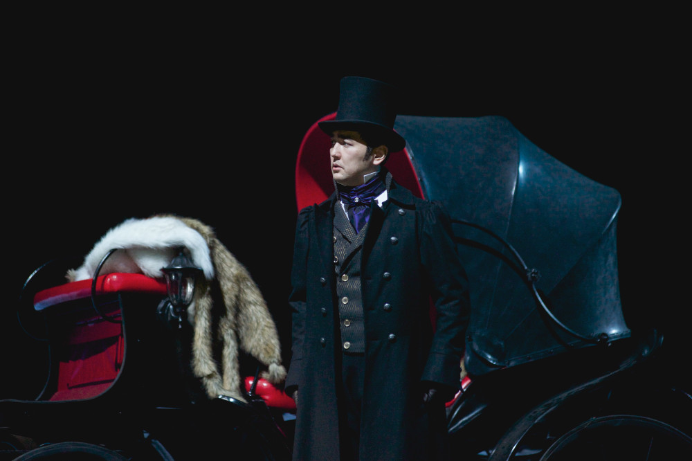 Не обошлась постановка и без животных: черный фаэтон, запряженный лошадью, появился на сцене, а в нем сидели пока еще друзья – Онегин и Ленский. Исполнение Онегина (Алексей Исаев, Талгат Мусабаев) и Ленского (Жан Тапин, Медет Чотабаев) было полно красоты и благородства. Вокалисты блестяще сумели передать драматизм в сцене дуэли. К слову, револьвер выстрелил с грохотом и яркими искрами, сцена выглядела очень натурально.