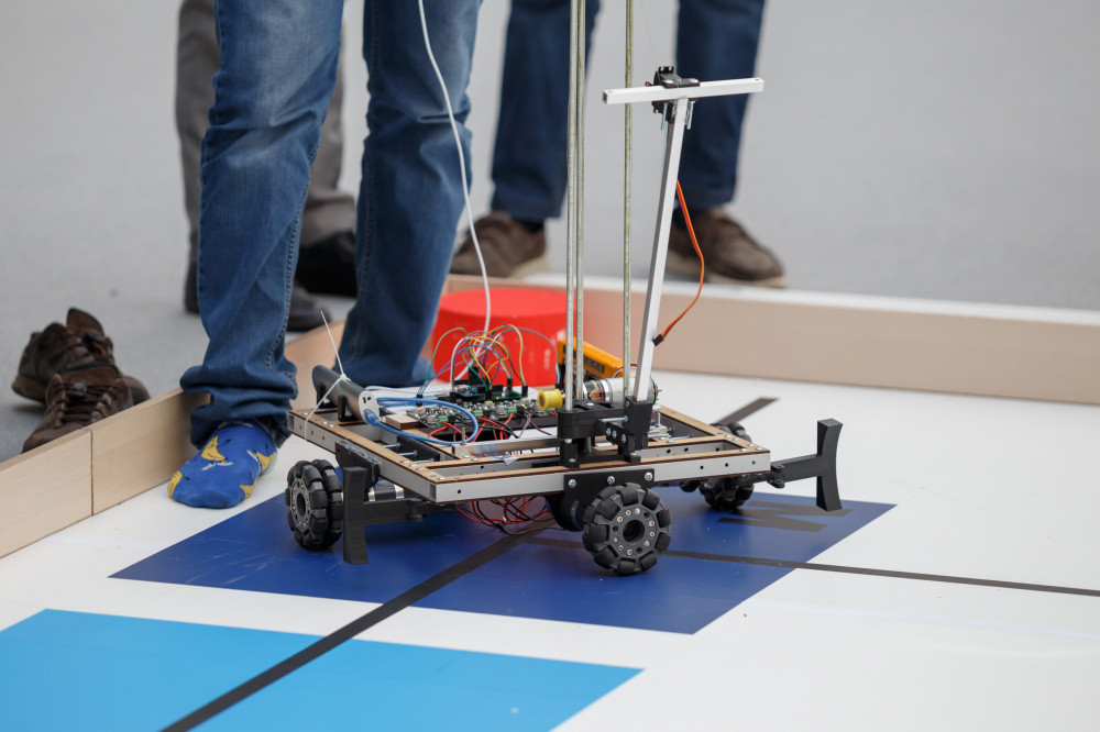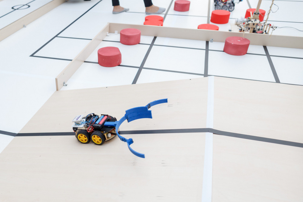 Задача перед участниками - на скорость передвигать и доставлять грузы до конечной точки. Задание нужно выполнить за три минуты. Каждая команда представила по два робота, управляемого и автоматического.