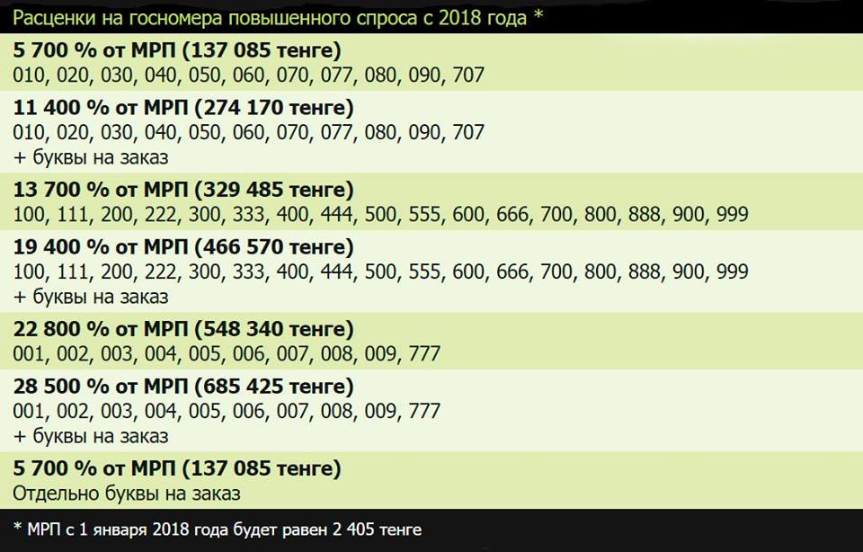 Кроме того, автовладелец может выбрать комбинацию только из трех одинаковых букв, оплатив госпошлину в размере 5 700 % МРП (137 085 тенге). При этом также выбрать любое цифровое сочетание без дополнительной оплаты (кроме 001, 002, 003, 004, 005, 006, 007, 008, 009, 010, 020, 030, 040, 050, 060, 070, 077, 080, 090, 707, 100,111, 200, 222, 300, 333, 400, 444, 500, 555, 600, 666, 700, 777, 800, 888, 900, 999, за которые предусмотрена повышенная госпошлина).