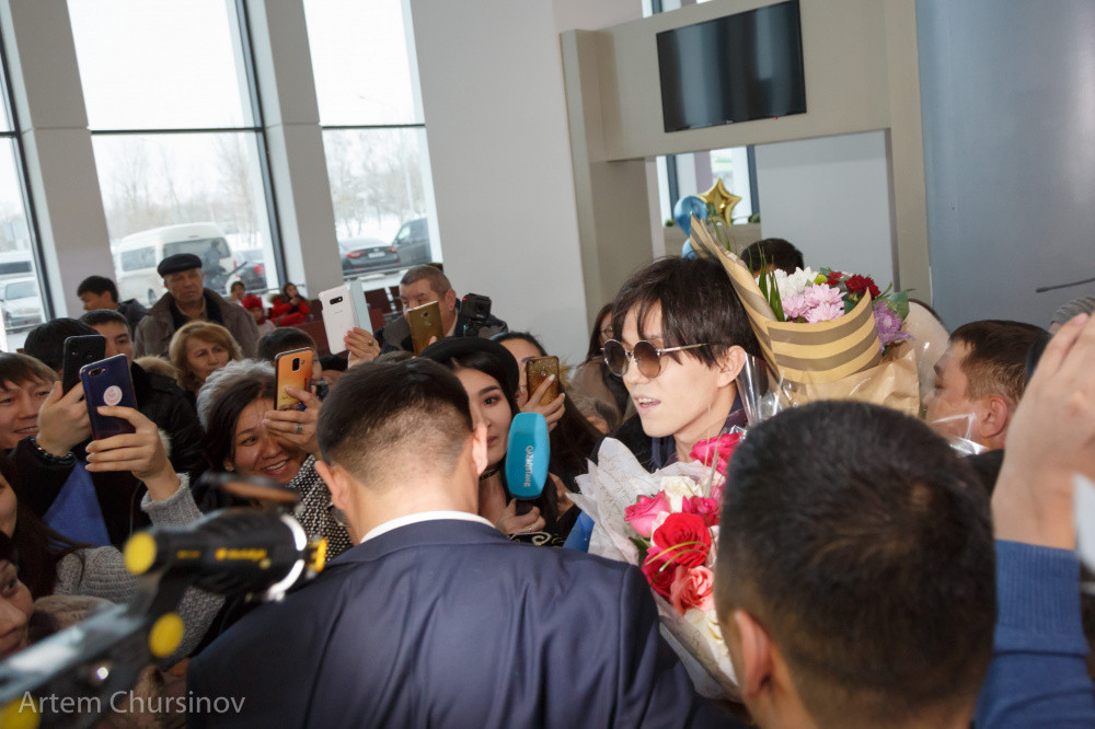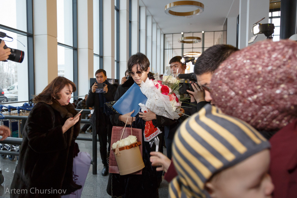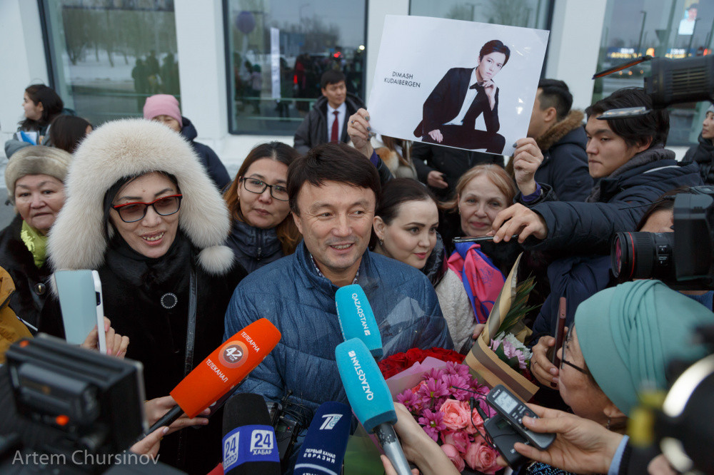 Как только Димаш Кудайберген вышел в зал прилета, его тут же обступили журналисты и армия фанатов.