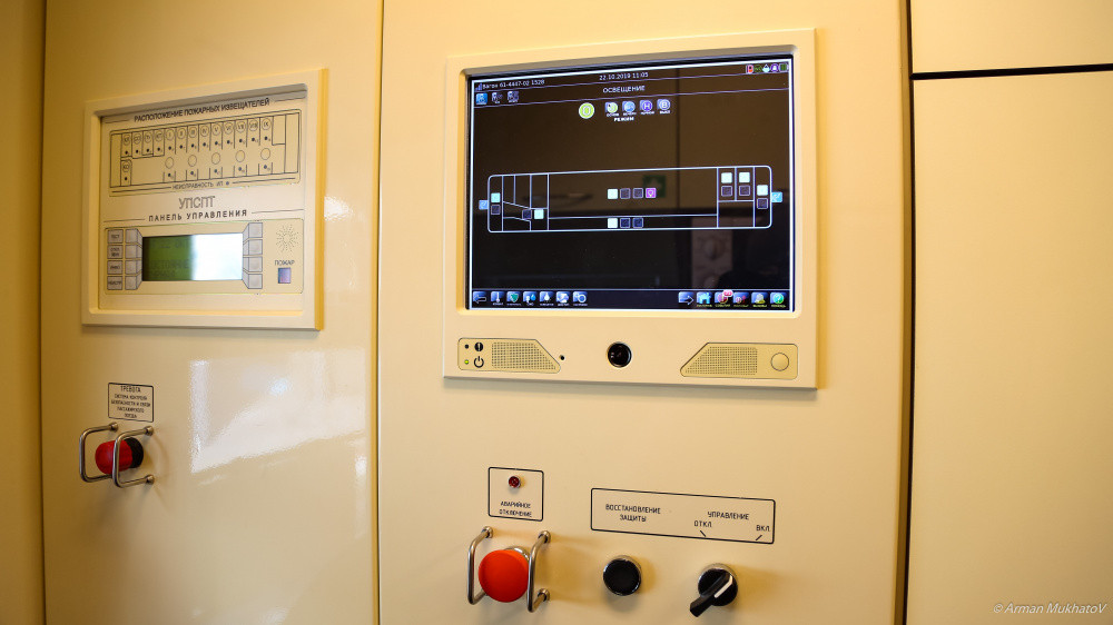 На фото — информационное табло по управлению вагоном."Мы с вами находимся в рабочем месте проводника. Перед нами — щит управления (система контроля и диагностики управления вагоном). Данное информационное табло позволяет контролировать, настраивать и следить за каждой системой в отдельности. Все системы максимально автоматизированы. Например, щит управления контролирует климатические параметры в вагоне. В автоматическом режиме он или добавляет температуру, или охлаждает вагон. Также включается микроволновая печать через данный пульт, система освещения: вечернее, ночное, дежурный режим...", — отметил Тлеуленов.