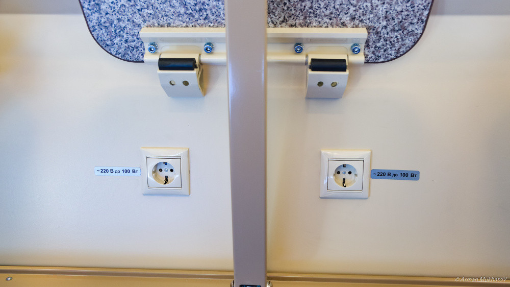 В каждом купе и коридорах установлены пара электрических зарядок напряжением 220B и пара современных USB-порта для зарядки мобильных телефонов.