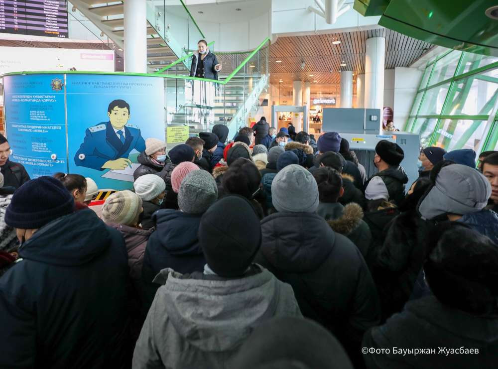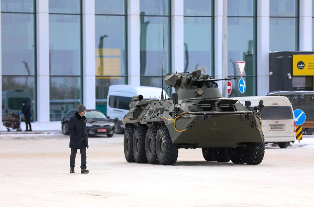 В аэропорту Нурсултана Назарбаева установлены блокпосты, дежурят солдаты, подвезена тяжелая бронетехника. На внутренние рейсы пассажиров допускают только после досмотра, на входе установлен металлоискатель.