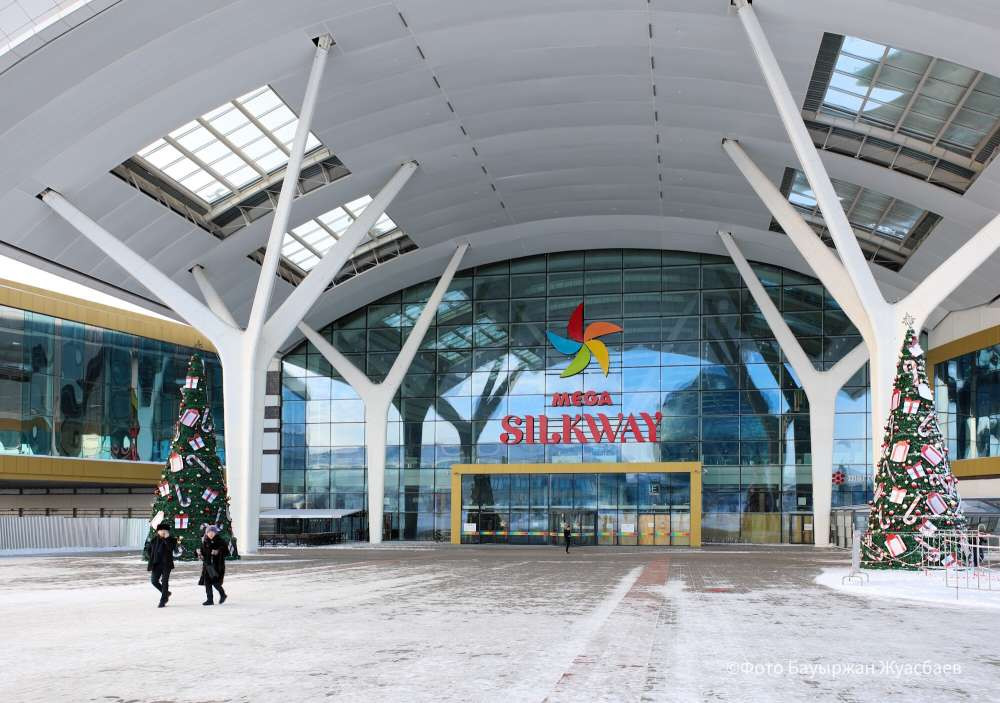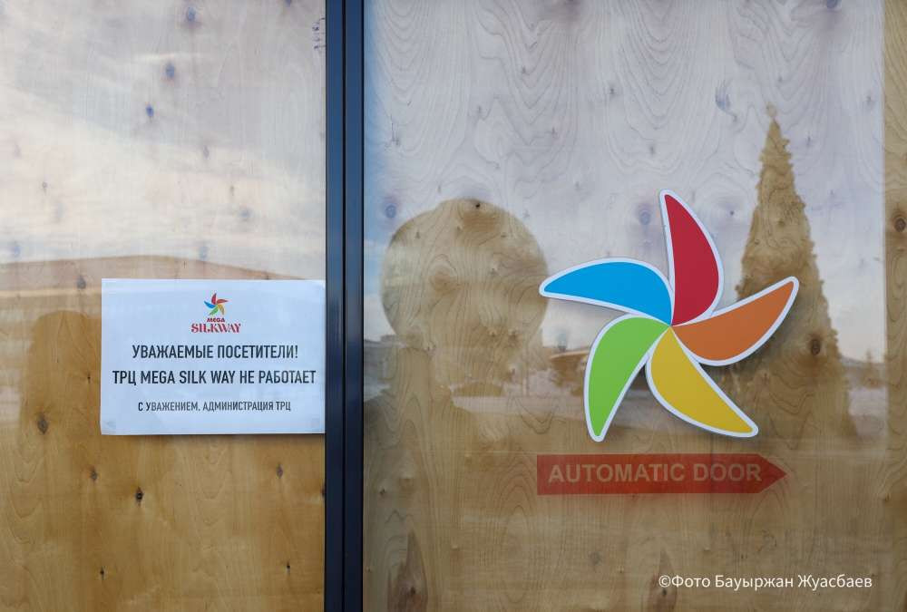 MEGA Silk Way, как и остальные ТРЦ, сегодня не работает. Помимо таблички на дверях, сотрудники торгового центра укрепили вход со стороны ЭКСПО досками. Покупатели все равно подходят к двери в надежде, что их, возможно, впустят, а также фотографируются возле елки.