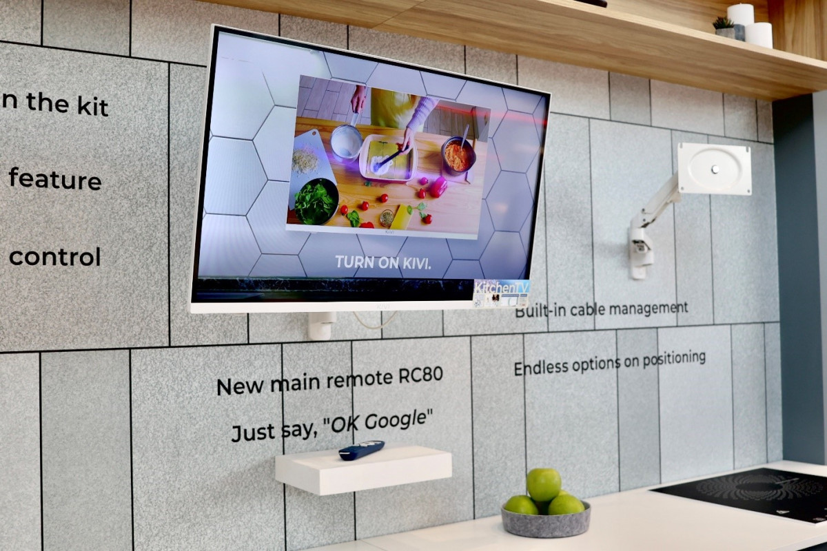 KIVI KitchenTV комплектуется специальным full-motion кронштейном для удобного монтажа на кухне. Он позволяет смотреть телевизор из любой точки комнаты. В модели предусмотрен датчик дыма и пульт с микрофоном для управления контентом hand free, когда вы заняты приготовлением пищи или пользуетесь мойкой.