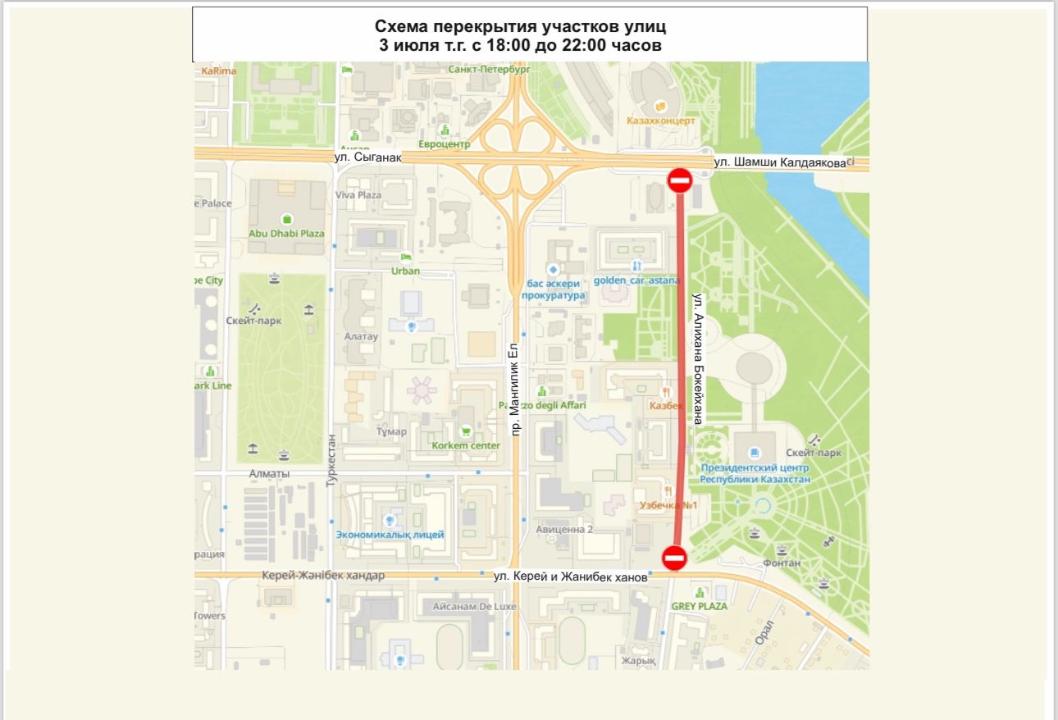 3 июля с 18:00 до 22:00 перекроют проезд по улице Бокейхана от улицы Керей-Жанибек хандар до моста по улицы Сыганак (М-3).