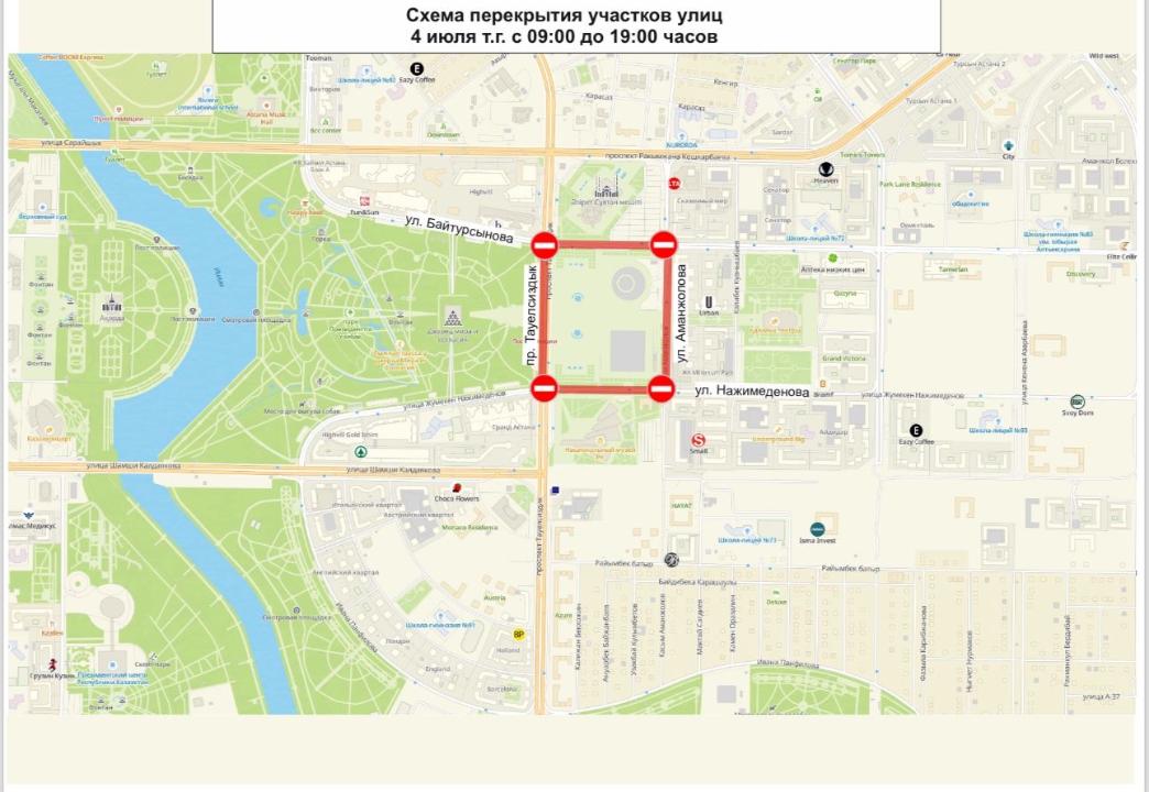4 июля с 9:00 до 19:00 будет закрыт участок дороги по улице Нажимеденова от проспекта Тауелсиздик до улицы Аманжолова, далее по улице Аманжолова до улицы Байтурсынова и по Байтурсынова до проспекта Тауелсиздик.