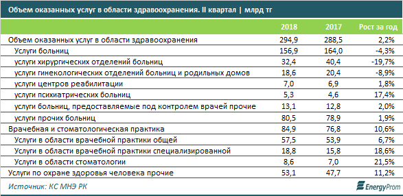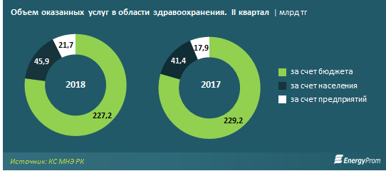 Объём услуг, оказанных в области здравоохранения за второй квартал текущего года, составил 294,9 млрд тенге - всего на 2,2% больше, чем годом ранее.