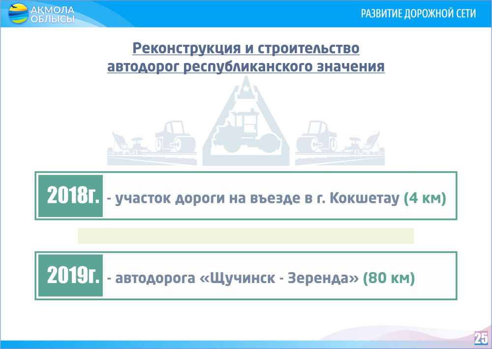 Также Малик Мурзалин сообщил, что в этом году  запланировано отремонтировать 293 км дорог, завершается строительство автодороги, соединяющей две курортные зоны  «Боровое» и «Зеренда».