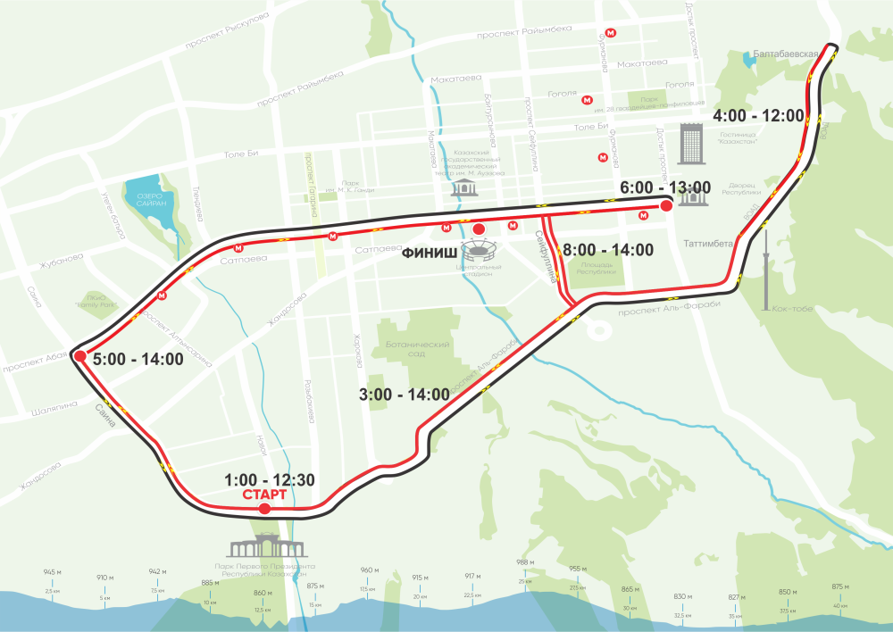 23 апреля на время проведения «Алматы Марафона» с 7.00 до 14.00 часов по времени Астаны будет частично перекрыто движение, проезд на автотранспорте в местах прохождения дистанций марафона будет временно невозможен.