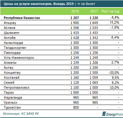 Дороже всего посещение кинотеатров обходилось кинолюбителям Атырау (1900 тенге за билет, +15,2% за год) и Астаны (1506 тенге за билет, −1,8% за год).