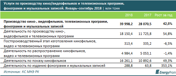 По итогам трёх кварталов объём услуг по производству кино- и видеофильмов, телепрограмм, фонограмм и музыкальных записей составил почти 40 млрд тенге. Это сразу на 42,5% больше, чем в аналогичном периоде 2018 года, передаёт BNews.kz со ссылкой на Energyprom.kz.