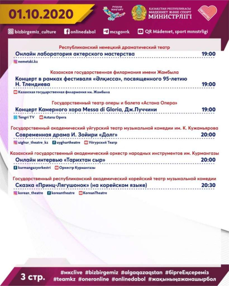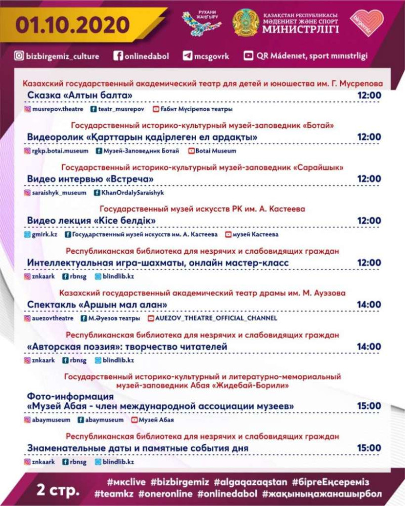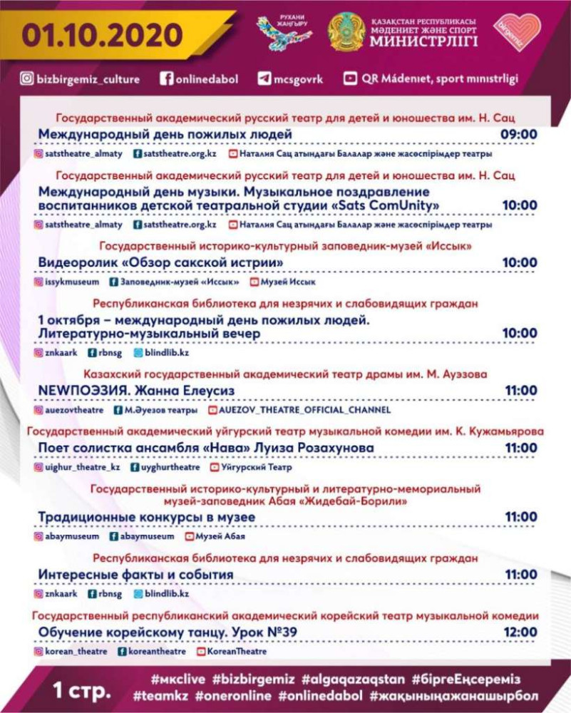 Программу культурных мероприятий на 1 октября опубликовали в Министерстве культуры и спорта Казахстана, передает BaigeNews.kz. Они пройдут в онлайн формате.