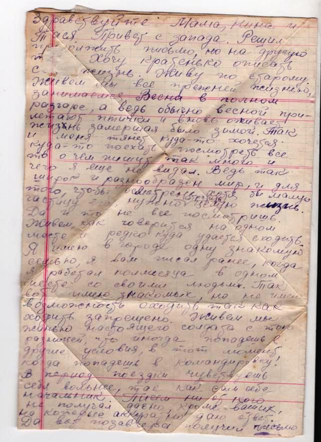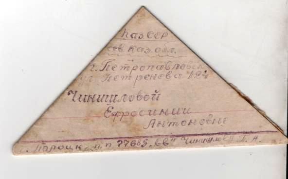 "Проверялось каждое письмо, — говорит Татьяна Ивановна. - Секретные данные о расположении военной части, планируемых операциях, имена командиров сразу "замарывались". Посылали весточки с фронта без конвертов, просто складывая в треугольники".