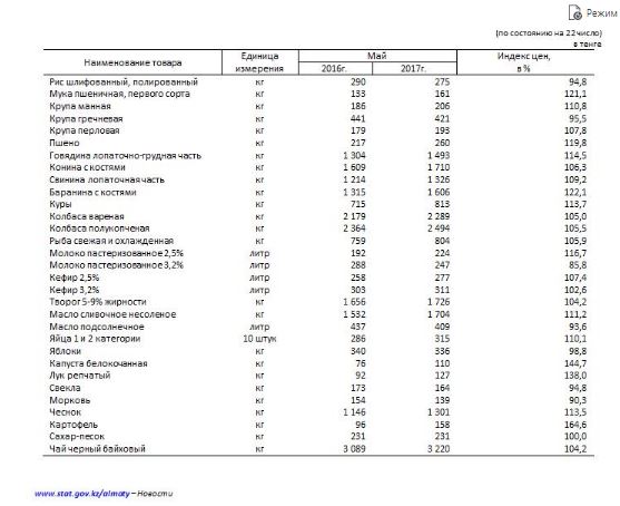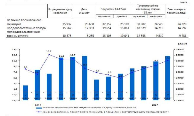 В свою очередь, в департаменте рассчитали прожиточный минимум на каждого алматинца, учитывая текущую обстановку на рынке. Так, величина прожиточного минимума в среднем на душу населения, рассчитанная исходя из минимальных норм потребления основных продуктов питания, в мае 2017 года составила 25 937 тенге и повысилась на 11,2% к маю 2016 года.