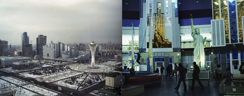 "Левый берег быстро развивался благодаря ряду "футуристических" зданий после того, как Казахстан перенёс свою столицу из Алматы в Астану в 1997 году. Справа: посетители проходят мимо уменьшенной версии Статуи Свободы в развлекательном центре "Думан" в Астане", - написал фотограф.