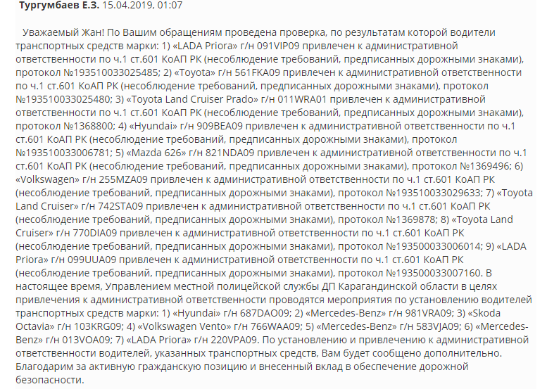 "В настоящее время управлением местной полицейской службы департамента полиции Карагандинской области в целях привлечения к административной ответственности проводятся мероприятия по установлению водителей ряда транспортных средств. Благодарим за активную гражданскую позицию и внесенный вклад в обеспечение дорожной безопасности", - ответил министр внутренних дел страны.