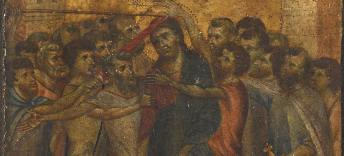 Эксперты парижской галереи Turquin с помощью инфракрасной рефлектографии подтвердили, что "Поругание Христа" было частью более крупного диптиха, созданного в 1280 году. Тогда Чимабуэ написал восемь сцен Страстей и Распятия Христа, и каждая из пары панелей содержала четыре изображения. Два из них, известные как "Богоматерь с младенцем с двумя ангелами" и "Бичевание Христа", находятся в Национальной галерее в Лондоне и в коллекции Фрика в Нью-Йорке.