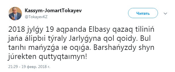 "2018 jylǵy 19 aqpanda Elbasy qazaq tiliniń jańa álipbıi týraly Jarlyǵyna qol qoidy. Bul tarıhı mańyzǵa ıe oqıǵa. Barshańyzdy shyn júrekten quttyqtaımyn!", - говорится в сообщении, размещенном на официальной странице Токаева в Twitter.