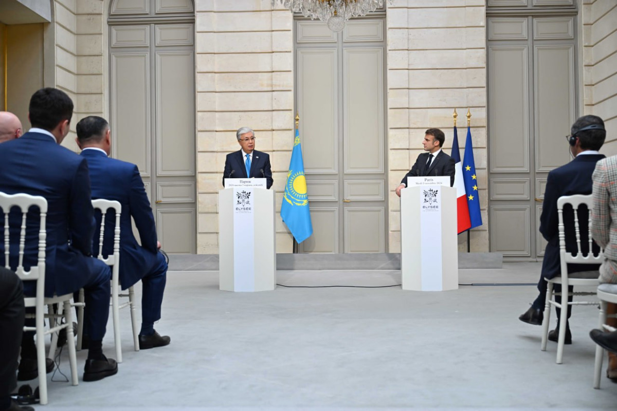 Касым-Жомарт Токаев и Эмманюэль Макрон провели брифинг для представителей СМИ