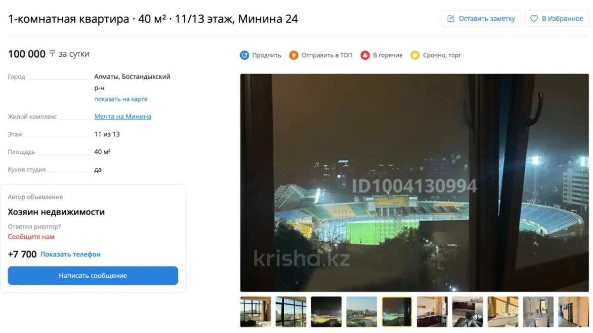 Так, однокомнатную квартиру в жилом комплексе напротив Центрального стадиона предлагают за 100 тысяч тенге в сутки.