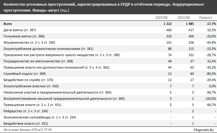 Также, согласно статистике, в Казахстане довольно часто злоупотребляли должностными полномочиями, присваивали или растрачивали вверенное чужое имущество, занимались посредничеством во взяточничестве и превышали власть или должностные полномочия.