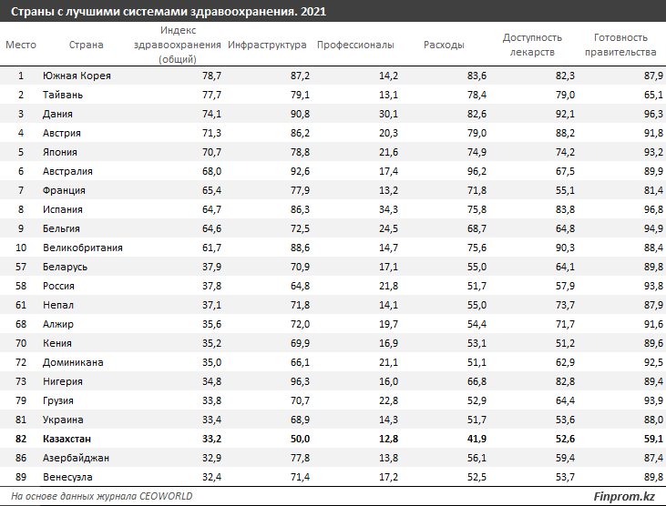 В мировом рейтинге по качеству медицины Казахстан занимает 82 позицию из 89, передаёт BaigeNews.kz со ссылкой на Finprom.kz.
