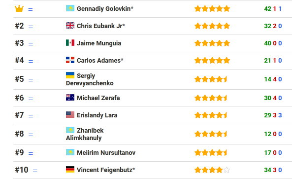 Отметим, что Казахстан в топ-10 имеет максимальное представительство. Все остальные страны представлены одним боксером: Крис Юбэнк-младший (Великобритания), Хайме Мунгия (Мексика), Карлос Адамес (Доминиканская Республика), Сергей Деревянченко (Украина), Майкл Зерафа (Австралия), Эрисланди Лара (Куба/США), Винсент Файгенбутц (Германия).