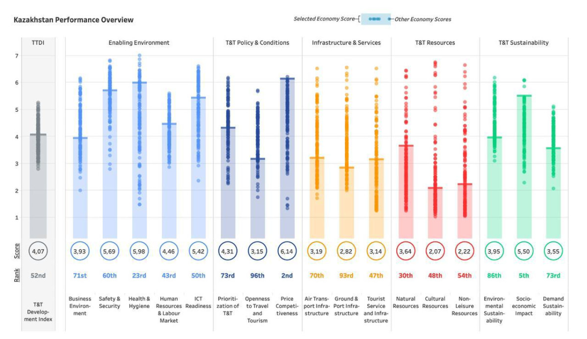 Казахстан занял 52 место из 119 в списке туристических направлений согласно индексу Всемирного экономического форума (World Economic Forum) о развитии путешествий и туризма, передаёт BaigeNews.kz.
