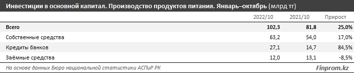 Более половины объёма инвестиций в сфере производства продуктов питания составили собственные средства предприятий: 63,2 миллиарда тенге, плюс 17% за год в стоимостном выражении.