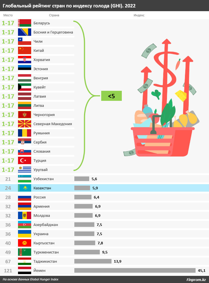 Индекс страны составил 5,9, передаёт BaigeNews.kz со ссылкой на finprom.kz. Чем ниже индекс, тем менее страна подвержена опасности голода.