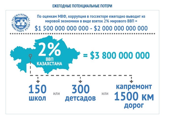 <p>По данным Международного валютного фонда, из-за коррупции мировой ВВП ежегодно теряет около 2%, что эквивалентно 1,5-2 триллионам долларов США. Если провести аналогичные расчеты на примере Казахстана, то ежегодные потенциальные потери составляют около 3,8 млрд. долларов США, говорится в «Национальном докладе о противодействии коррупции», передает BNews.kz. </p>