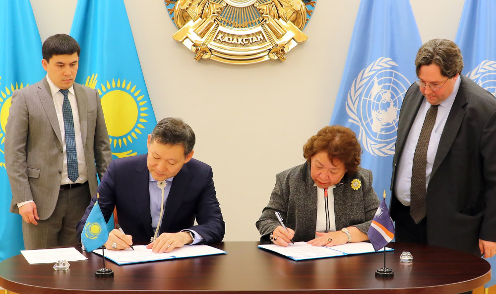 Постоянные представители Казахстана и Маршалловых островов при ООН Кайрат Умаров и Аматлайн Элизабет Кабуа подписали в Нью-Йорке совместное коммюнике об установлении дипломатических отношений между двумя государствами, передаёт BNews.kz со ссылкой на пресс-службу внешнеполитического ведомства.