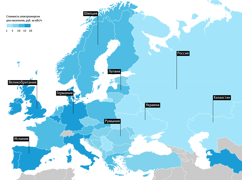 Самая высокая стоимость электроэнергии для населения, согласно рейтингу, в Дании- 19,8 руб. (около 107.3) за кВт∙ч и в Германии – 19,1 руб. (около 103.59) за кВт∙ч. В первую пятерку по дороговизне электричества входят также Бельгия, Португалия и Италия.