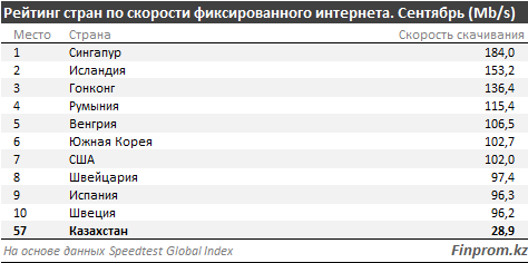 Среди стран ЕАЭС Казахстан находится на третьем месте после России и Беларуси. Абсолютным мировым лидером является Сингапур: 184 Mb/s. Далее Исландия и Гонконг — 153,17 и 136,43 Mb/s соответственно.