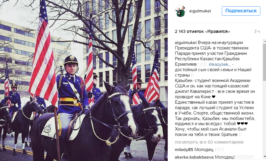 «Вчера на инаугурации Президента США – в торжественном параде принял участие Гражданин Республики Казахстан Казыбек Ермегияев – достойный сын своей семьи и нашей страны. Единственный казах принял участие в параде, как лучший студент за успехи в учебе, спорте, общественной жизни. Так держать, Казыбек. Қазыбек — студент военной Академии США, и он, как настоящий казахский джигит, кавалерист, все свое время он проводит на Коне», — пишет Мукей.