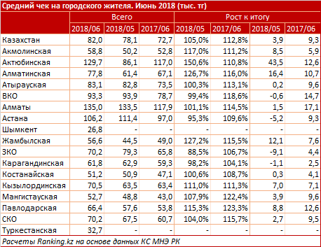 На сельскую местность приходится в среднем всего 7-8% официальной розничной торговли, поэтому при расчете среднего чека учитывается городское население РК.