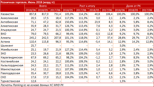 Наибольший объем розничной торговли пришелся на Астану (110,4 млрд тенге) и Алматы (245,2 млрд тенге) - 41,5% от доли страны.