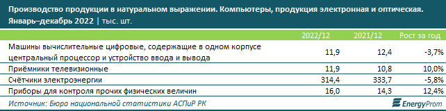 Выросло производство телевизионных приёмников (плюс 10 процентов, до 11,9 тысячи штук), а также различных измерительных приборов, помимо электросчётчиков (плюс 12,4 процента, до 16 тысячи штук).