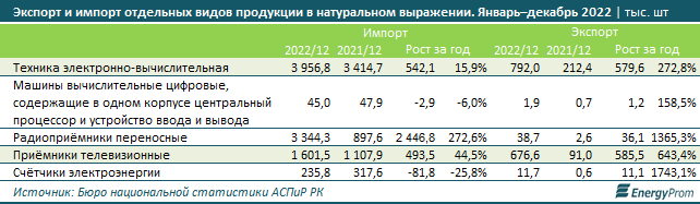 Прошлый год можно назвать весьма удачным для экспортёров электронной продукции из Казахстана. По всем товарным позициям заметен значительный прирост поставок. Экспорт переносных радиоприёмников вырос в 15 раз, счётчиков электроэнергии — почти в 20 раз, телевизионных приёмников — в 7 раз, электронно-вычислительной техники — в 3,7 раза.