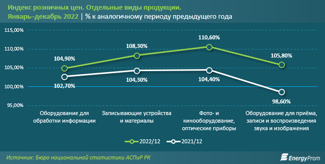 Что касается изменения стоимости продукции этой товарной категории для населения, согласно данным Бюро национальной статистики АСПиР, в 2022 году индексы розничных цен оказались следующими: в категории оборудования для обработки данных - 104,9 процента (на 2,2 процентного пункта выше показателя предыдущего года), в категории фото-, кинооборудования и оптических приборов — 110,6 процента (в 2021 году показатель был ниже — 104,4 процента).