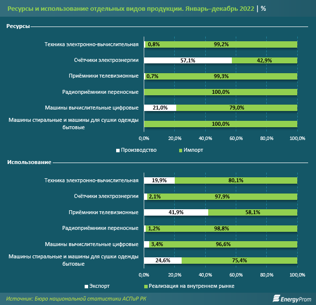 Ни по одному из четырёх видов производимых товаров электронной промышленности Казахстан не обеспечивает себя самостоятельно. Лишь по счётчикам электроэнергии отечественные производители выпускают 51,7 процента от общего объёма использования, по остальным товарам властвует импорт. Электронная продукция "made in Kazakhstan" хоть и экспортируется, но в небольших объёмах. Доля казахстанского экспорта в общей статистике использования мала: от 1 до 3 процентов.