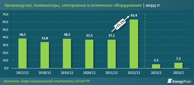 Первые два месяца текущего года поддерживали взятый темп. За январь-февраль 2023-го электронная промышленность произвела товаров на 7,2 миллиарда тенге, плюс 39 процентов к аналогичному периоду прошлого года.