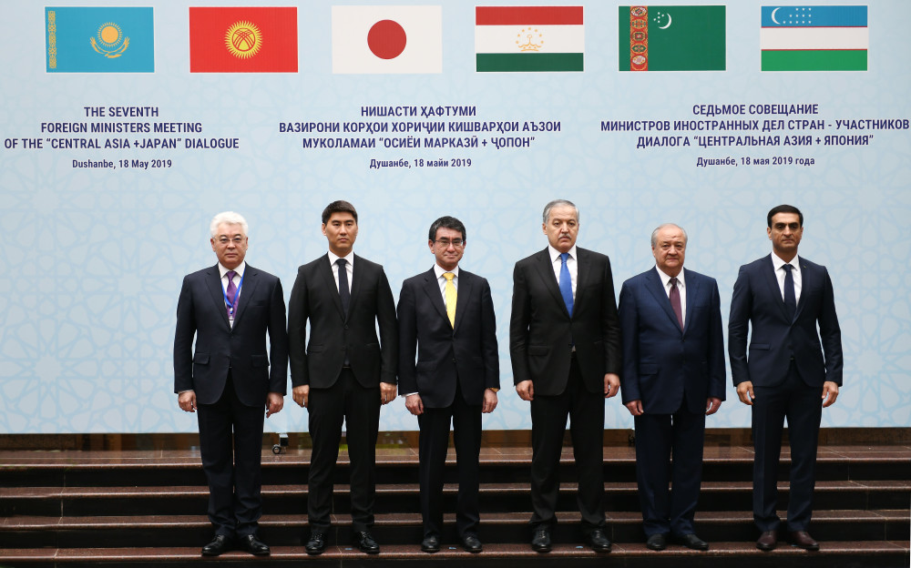 На площадке собрались Министр иностранных дел Кыргызстана Чингиз Айдарбеков, Министр иностранных дел Таджикистана Сироджиддин Мухриддин, Министр иностранных дел Узбекистана Абдулазиз Камилов, Министр иностранных дел Японии Таро Коно, заместитель Министра иностранных дел Туркменистана Вепа Хаджиев.