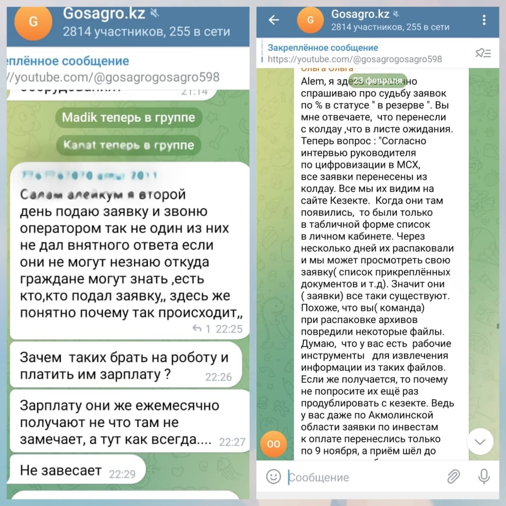 "Через средства массовой информации было объявлено, что сайт gosagro.kz запущен, но это ложная информация. Непонятно, почему министерство сельского хозяйства так сообщает. Но сейчас платформа не работает, мы еще не подали ни одной заявки. Функция субсидирования процентной ставки не работает. В телеграм чатах тоже много вопросов задают. Админы чата, ІТ специалисты не отвечают. Часто приходят ответы: "мы работаем, подождите", иногда вопросы остаются совершенно без ответа", – добавил он.
