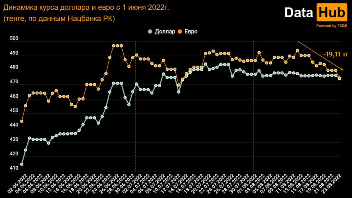 Еще 12 августа официальный курс евро составлял 493,67 тенге. То есть за 11 дней он снизился на 19 тенге 11 тиын. Или 3,9 процента.