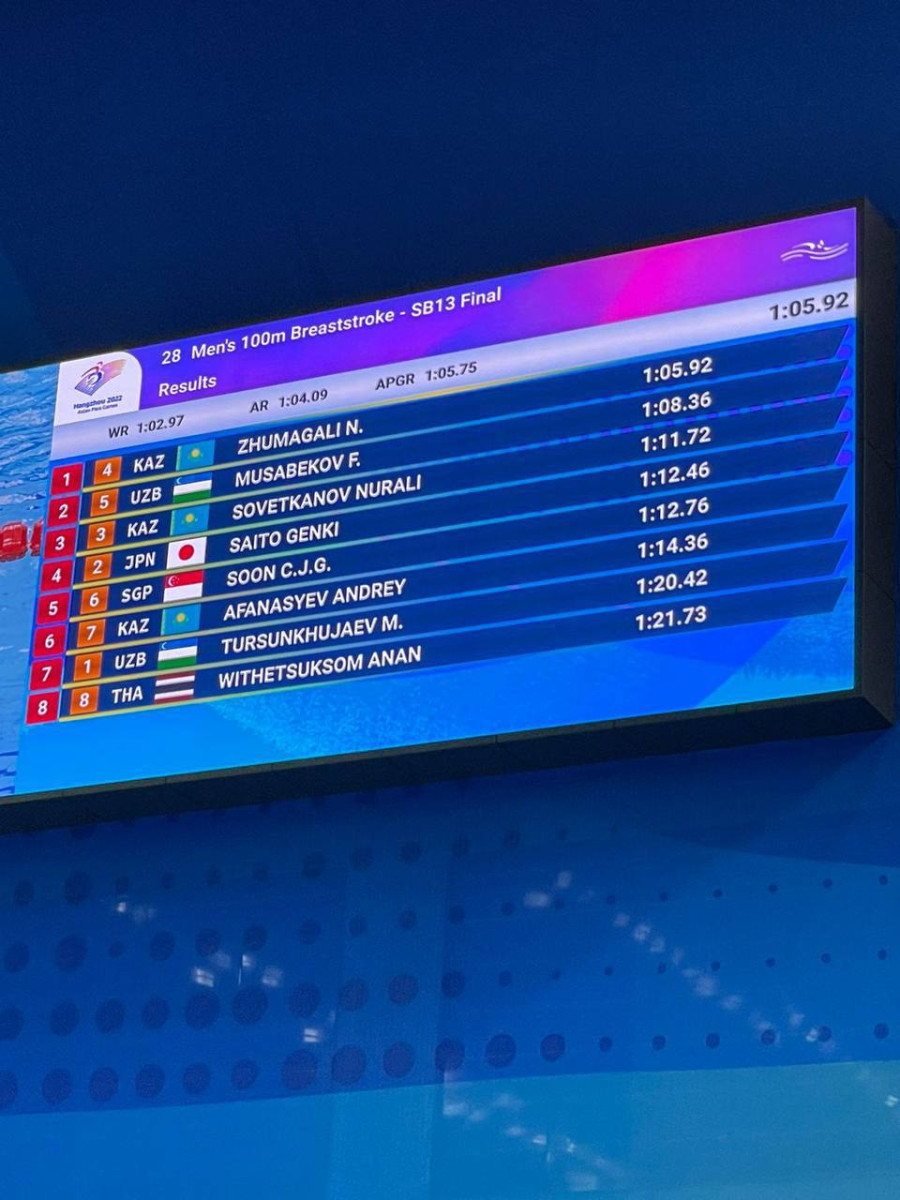 Жумагали проплыл дистанцию 100 метров брассом за 1:05:92. Он принёс пятое "золото" в копилку сборной на Азиаде.